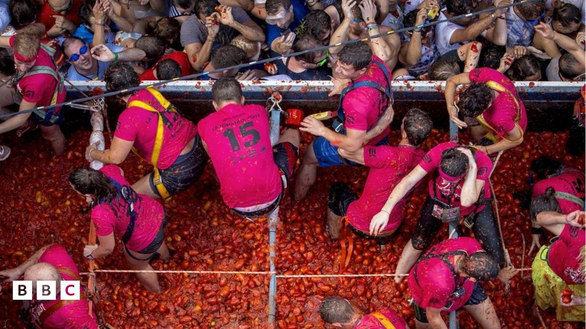 More than 22,000 people from across the world have gathered in the small Spanish town of Bunol to celebrate the 70th annual Tomatina Festival by throwing 150 tonnes of squashed tomatoes at each other.