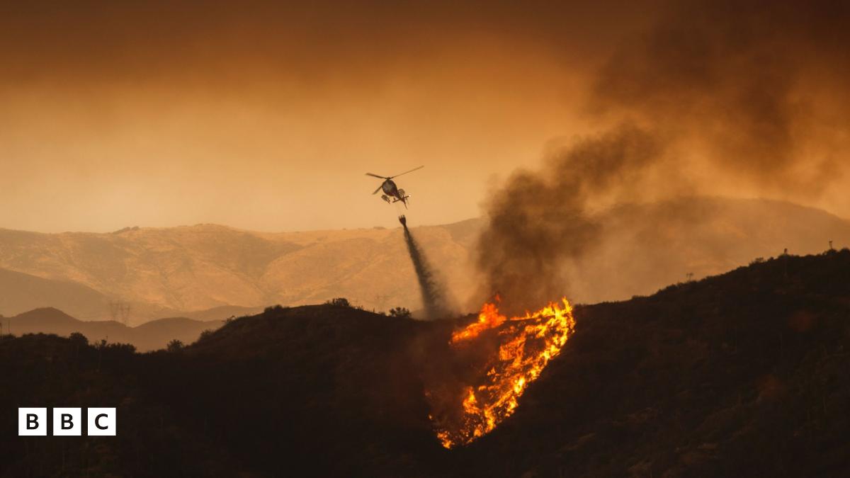 A firefighting helicopter drops water at the Sand Fire on July 23 2016 near Santa Clarita, CaliforniaImage source, AFP