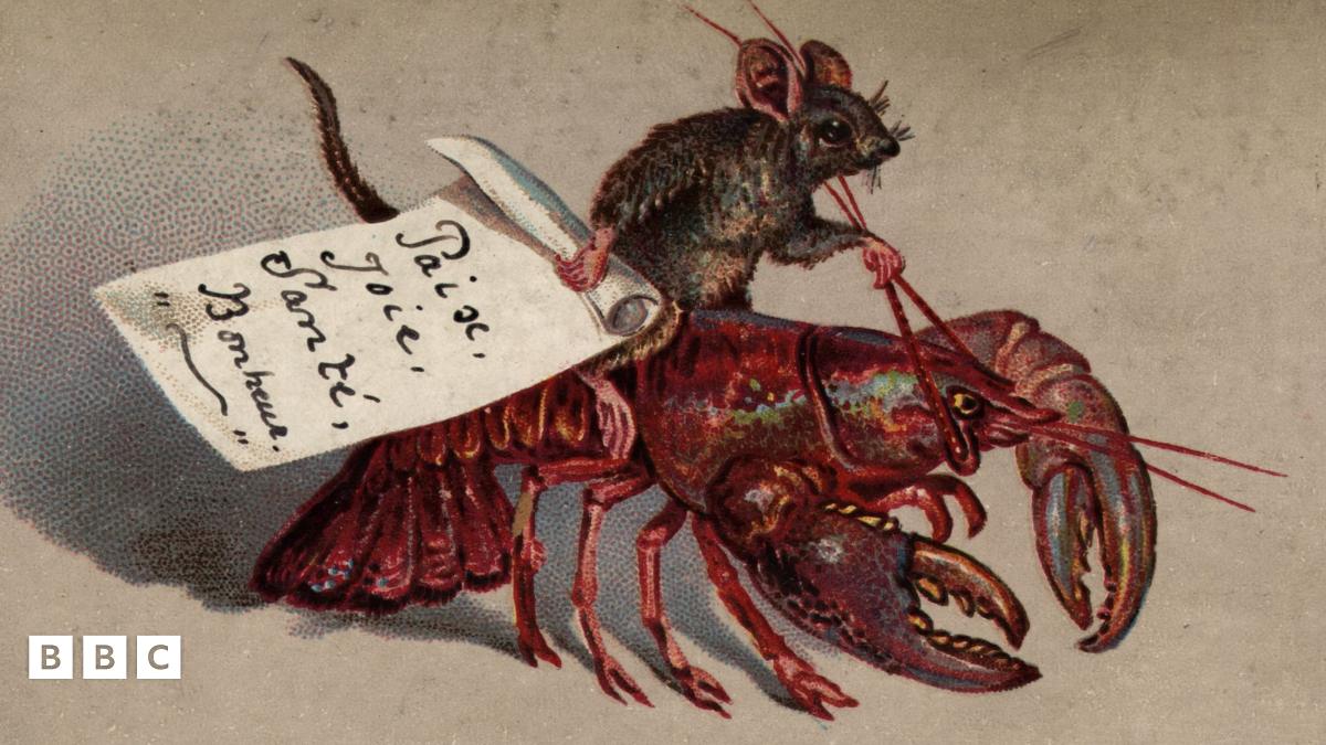 A bit like we're struggling to see what tennis and sunflowers have to do with Christmas, we definitely can't work out what a mouse riding a lobster has to do with the festive season. But the Victorians seemed to think this was a suitable Christmas scene, according to this card from around 1880.
