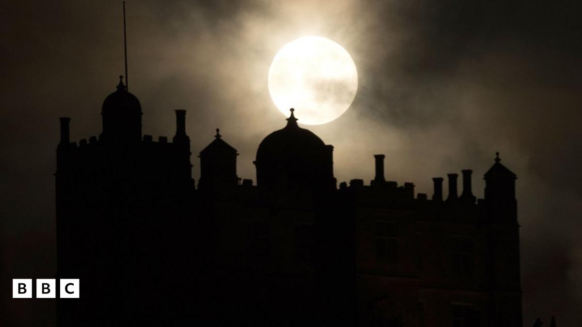 A mystical scene is set as the moon hovers over Bolsover Castle in Derbyshire.