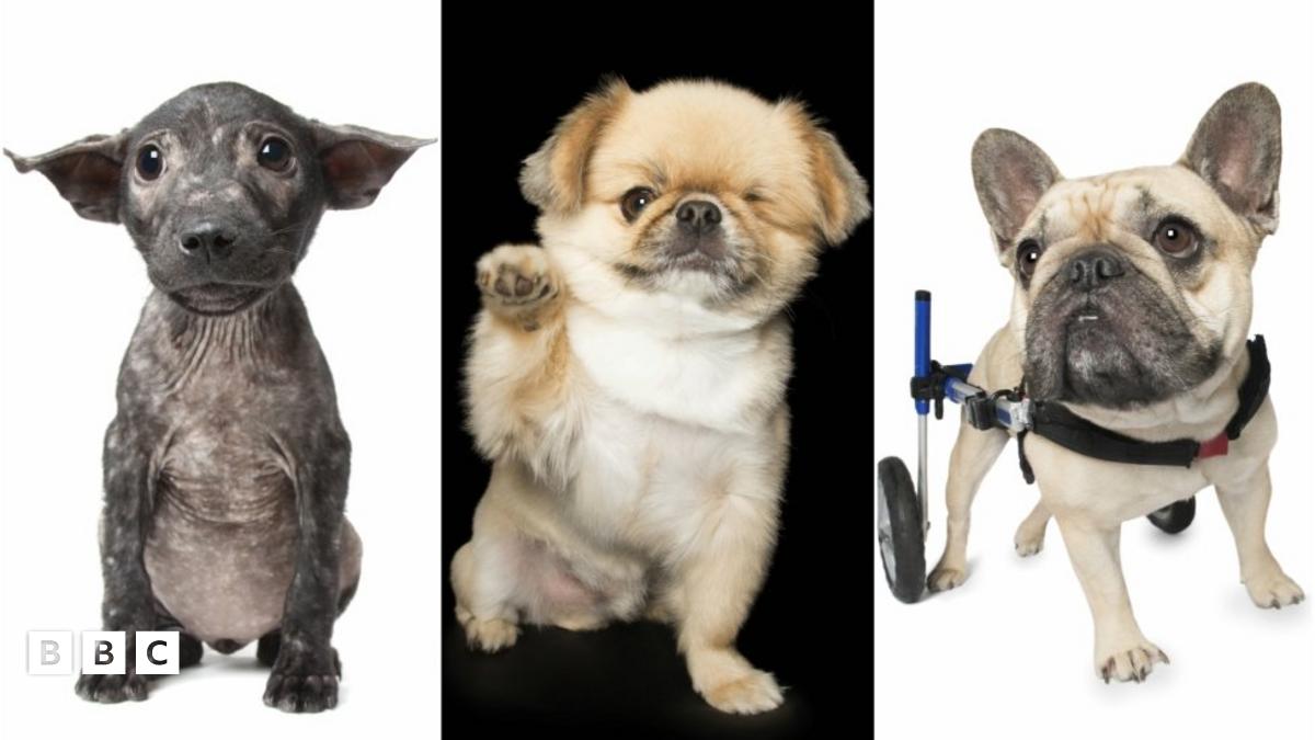 A dog with big brown eyes and big ears stares to its right while wearing a wheelchair.Image source, Alexandra Cearns