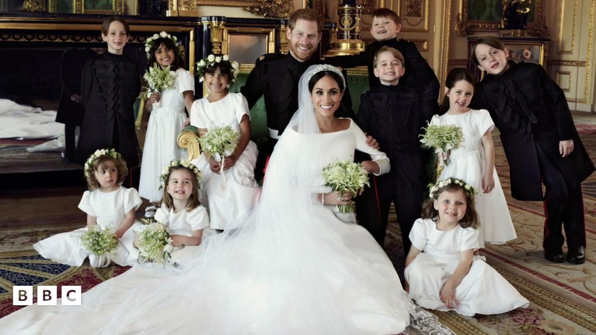 The pictures show the couple - now known as the Duke and Duchess of Sussex - with all their bridesmaids and pageboys, including Prince George and Princess Charlotte.