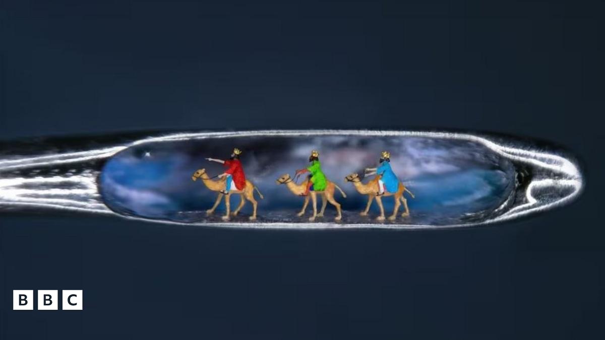 Well known micro-sculptor Willard Wigan worked 16 hours over four weeks to create the artwork, showing the three wise men wearing gold crowns and riding camels.