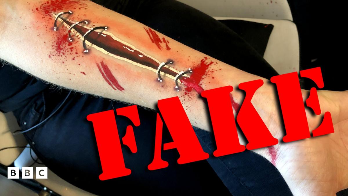 Make-up artist Samantha Helen has shown Newsround a simple step-by-step way to create some seriously gory Halloween make-up! To start creating your fake wound, take a dark red colour and paint a mark like this, with tapered ends.