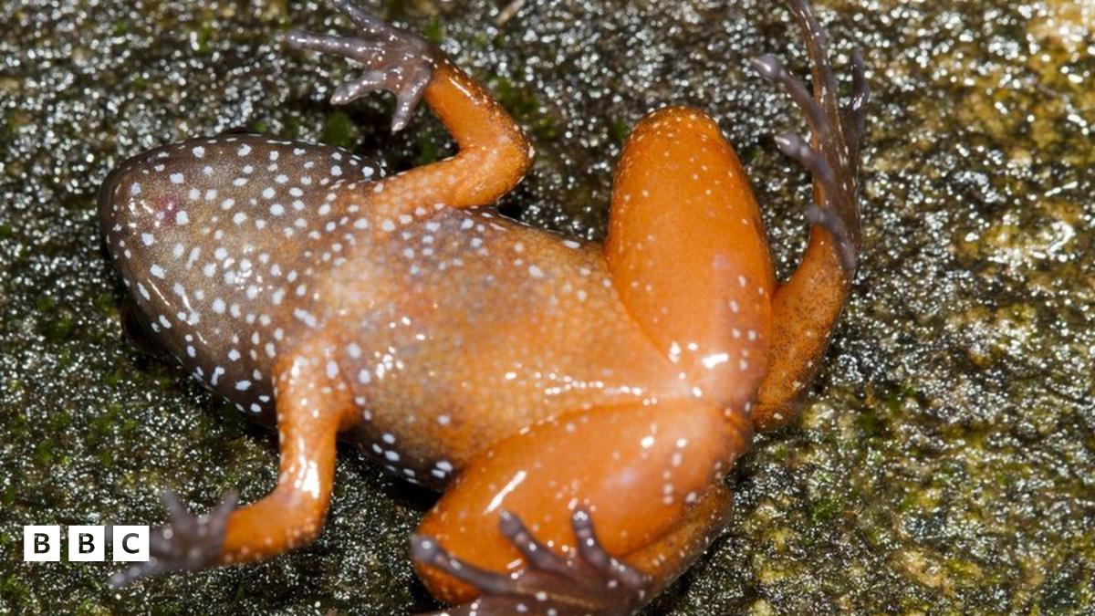 The researchers have nicknamed them starry dwarf frogs because they're around the size of an adult's thumb, have an orange belly, a brown back and are covered in white spots.