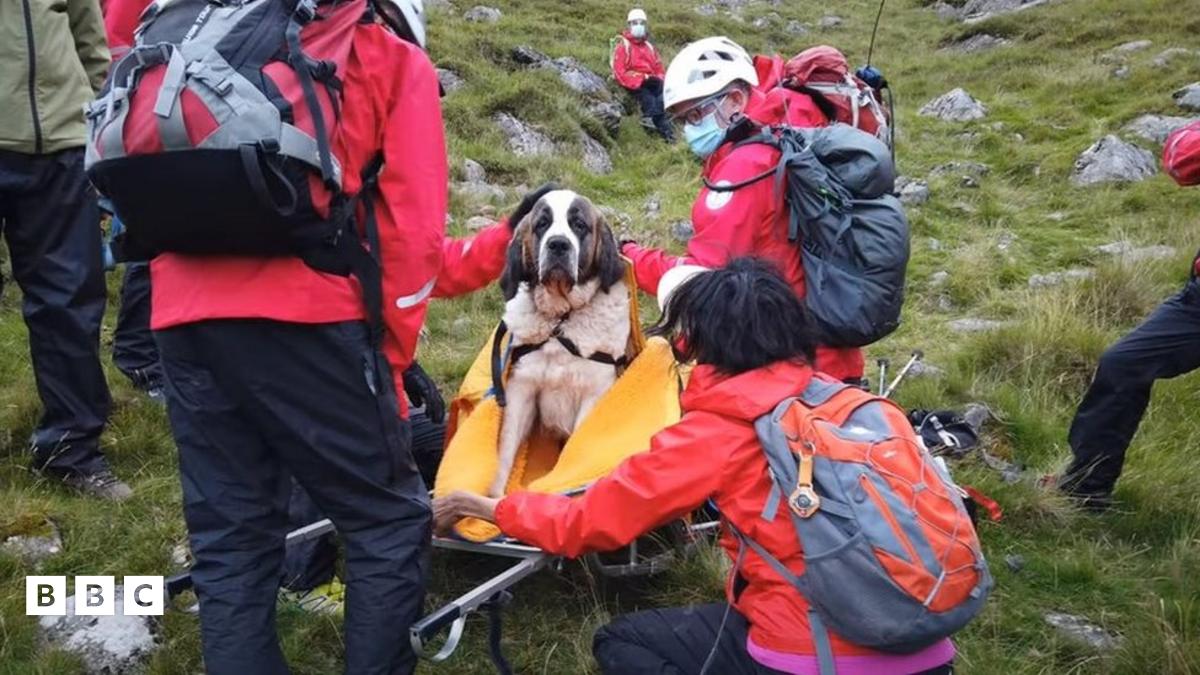 A St Bernard dog was rescued after collapsing while walking down England's highest mountain. Members of the Wasdale Mountain Rescue Team (MRT) went to four-year-old Daisy's aid on Scafell Pike. The rescuers said she was extremely compliant, which made carrying her down the mountain much easier!