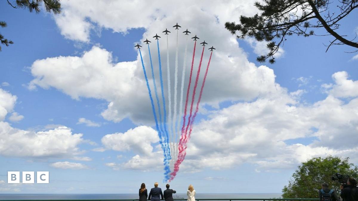 In this photograph, we see US President Donald Trump, First Lady Melania Trump, French President Emmanuel Macron and his wife Brigitte Macron watch as the French elite acrobatic flying team, called Patrouille de France, complete a commemorative flyover, following a special ceremony to remember those who fought on 6 June 1944.