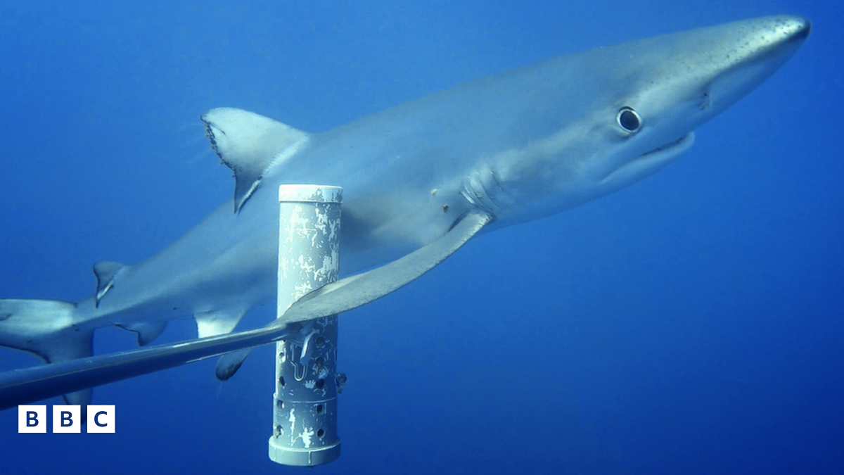 Blue shark (Prionace glauca) swims past bait cannister