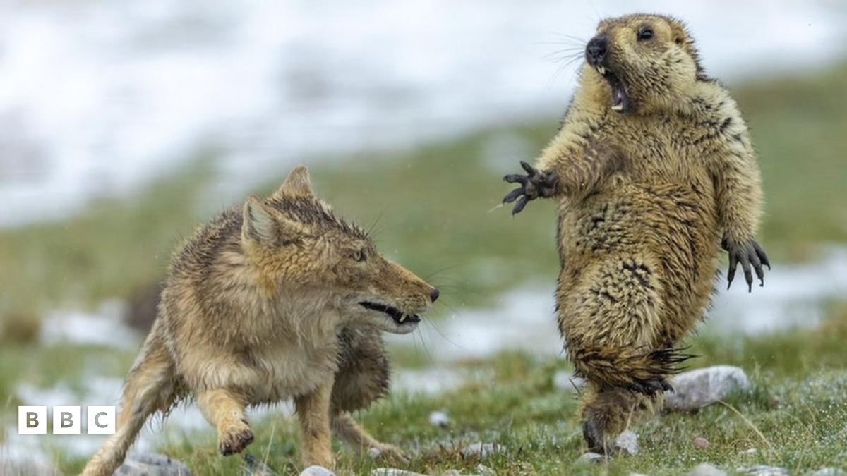 This photo was crowned the Grand Title Winner. It's called The Moment and shows a standoff between a Tibetan fox and a marmot. It was taken by Yongqing Bao who's a wildlife photographer from China. Now that is quite a facial expression!