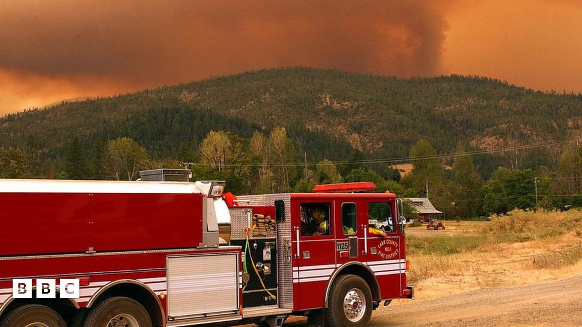 fire truck in oregon on the way to help wildfires. lots of smoke in the background.Image source, Getty Images