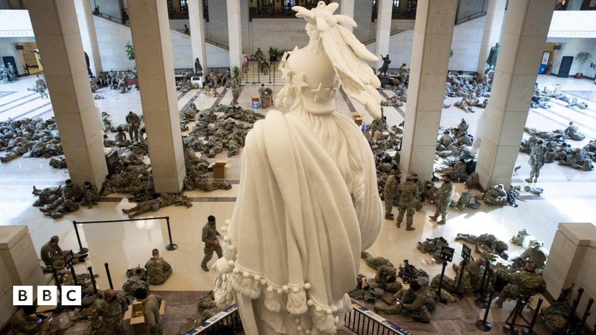 Hundreds of US National Guard troops have been deployed to protect the Capitol building in Washington DC - with many of them seen sleeping on the floor there.