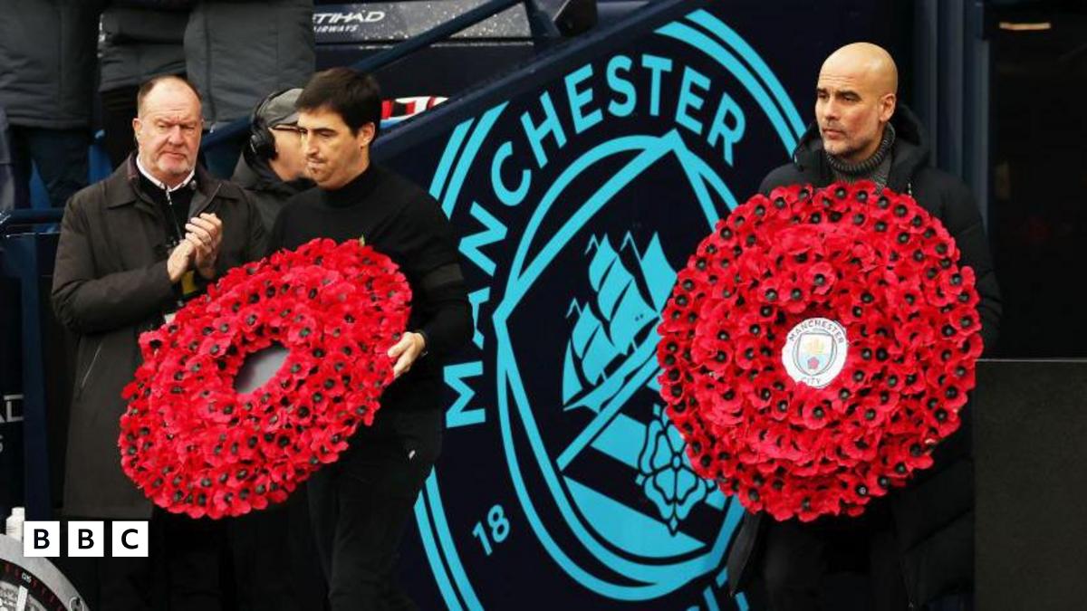 Andoni Iraola, manager of AFC Bournemouth, and Pep Guardiola, Manager of Manchester City, hold poppy wreaths on November 04, 2023 in Manchester, EnglandImage source, Getty