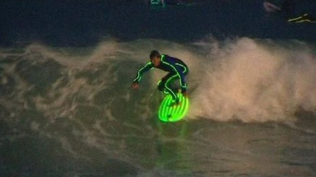 Surfers that glow in the dark!To play this video you need to enable JavaScript in your browser.This video can not be playedSurfers that glow in the dark!CloseSurfers in Australia welcomed the arrival of summer with a special night surfing session in neon-lit wetsuits that made them glow in the dark!Published1 December 2011Read description