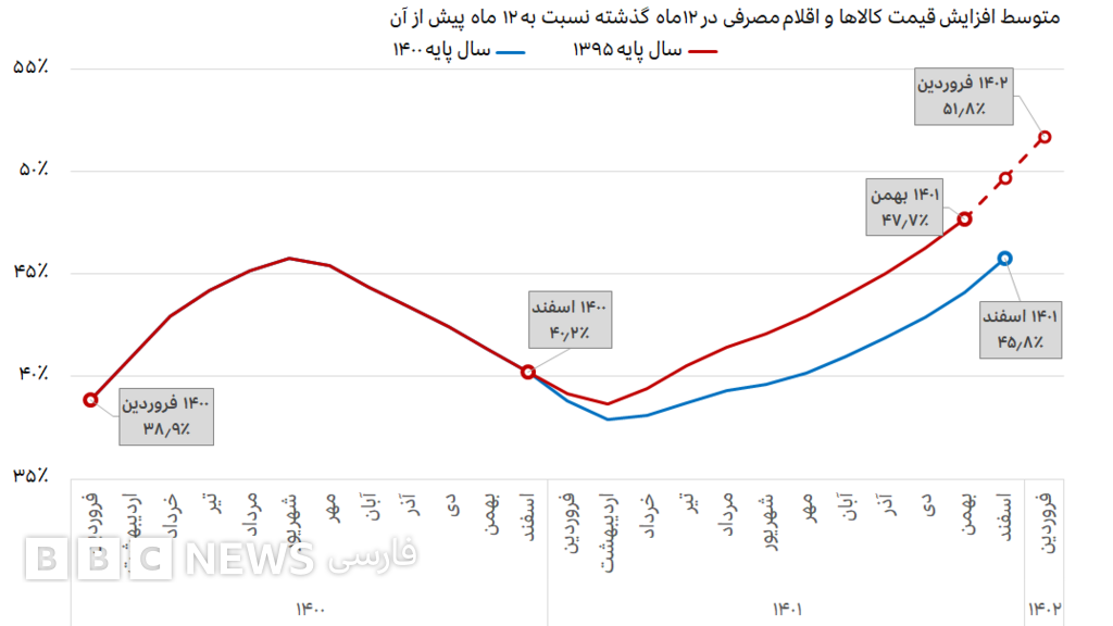 محاسبات بیبیسی فارسی نشان میدهد که در صورت تغییر نکردن سال پایه محاسبات تورم، شاخص اصلی تورم (نرخ تورم ۱۲ماهه) فروردین امسال به ۵۱.۸ درصد میرسید که بالاترین رقم رسمی تورم از سال ۱۳۲۲ است.