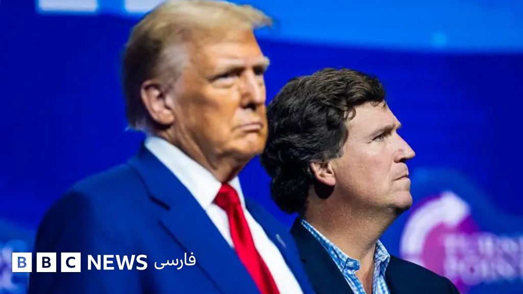توضیح تصویر، دونالد ترامپ و تاکر کارلسون در همایش ملی حزب جمهوری‌ خواه در میلواکی، ایالت ویسکانسین، ژوئیه ۲۰۲۴