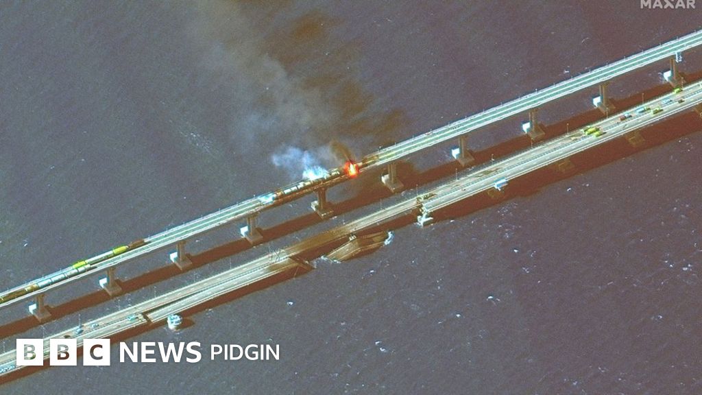 But new satellite images wey dem release on Saturday show smoke and fire near di collapsed areas of di 19km (12-mile) bridge, wey dem open with much fanfare four years afta Moscow annexed Crimea.
