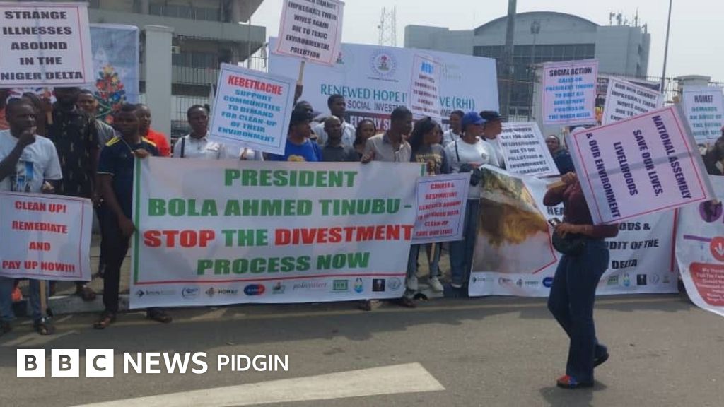 Di protest by environmental advocacy groups like Social Action, Health of Mother Earth Foundation (HOMEF), Kebetkache Women Development and Resource Centre, We The People and some local communities dey ask Nigeria President Bola Tinubu not to allow international oil companies (IOCs) to go on wit di divestment process wen dem never clean up di many sites wey oil spillage don damage across di Niger Delta region.