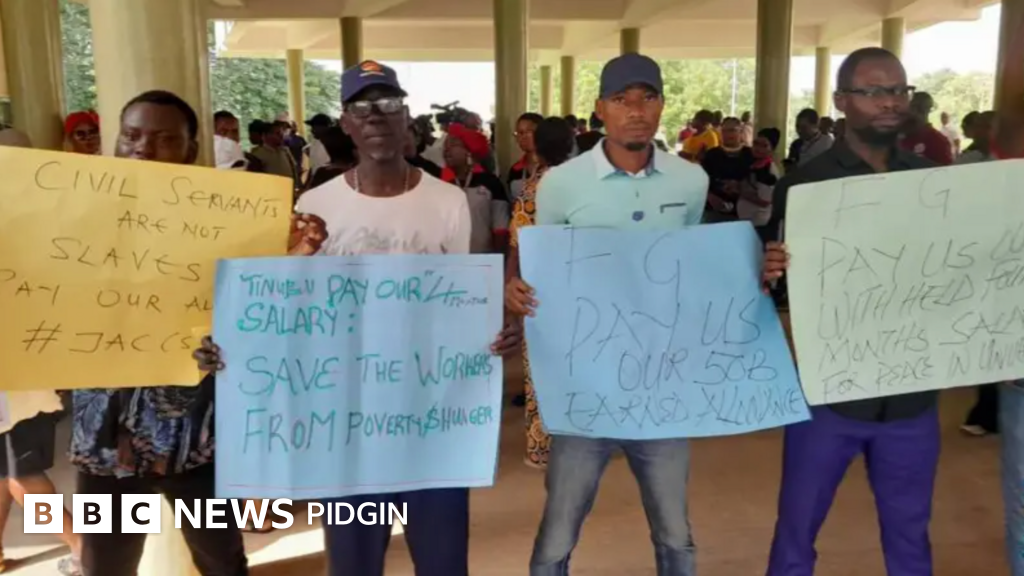 "We don write plenty times to di ministries wey dey involved but up till now, we neva receive dat salaries," oga Duru tok.