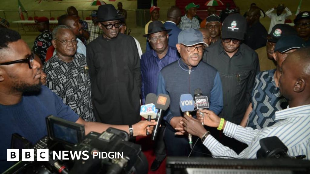 PDP dey divided into two groups - one wey FCT Minister Nyesom Wike dey lead and di oda one wey Oyo State Govnor Seyi Makinde dey control.