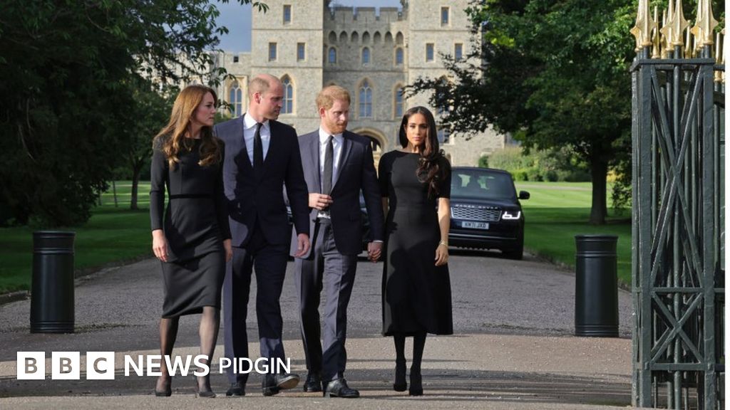 Moment di Prince and Princess of Wales and di Duke and Duchess of Sussex chat wit crowds of pipo wey line up for street near di gates of Windsor Castle. Dem also look tributes pipo leave for Queen Elizabeth II.