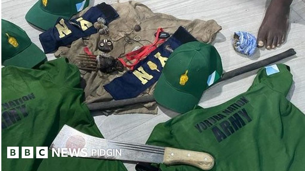 Di suspects wey police arrest for Lagos bin carry “charms, dangerous weapons and different offensive tins wey carry symbol of Yoruba Nation Army,” Hundeyin tok.