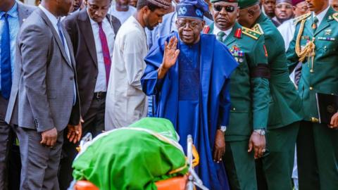 Among dose wey paid dia respect to di bodi of di late former president include: current President of Nigeria, Bola Tinubu, Vice President Kassim Shettima, First Lady Oluremi Tinubu and oda top dignitaries..