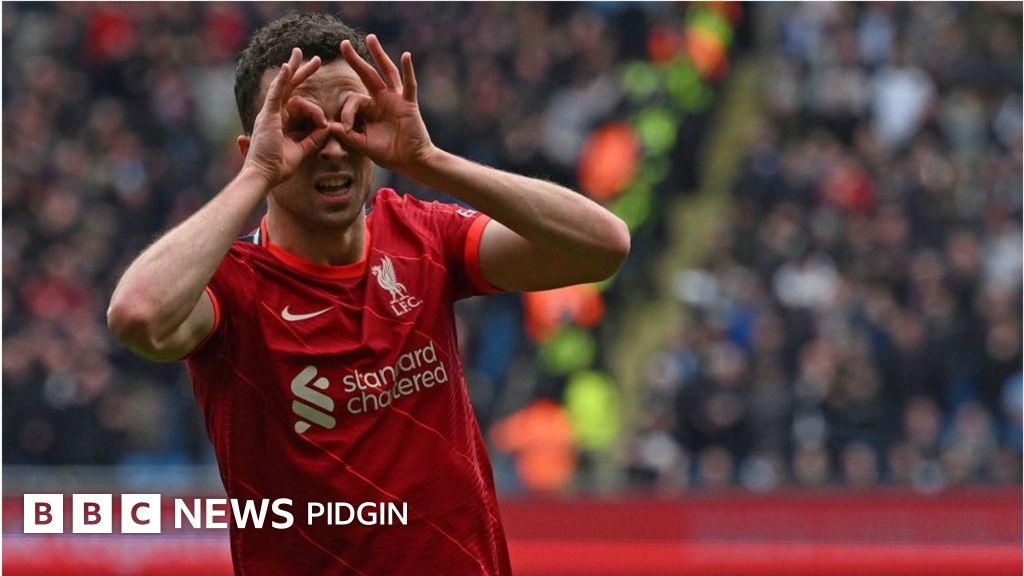 Liverpool hit back six minutes afta City take di lead. City head one attack away but Andy Robertson send deep cross back inside Liverpool eighteen. Im put on a plate for Diogo Jota to score.