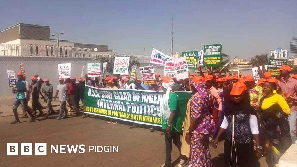 'If you give Atiku visa you dey support corruption' - na wetin one group of protesters on Wednesday tell American Embassy for Abuja, Nigeria.