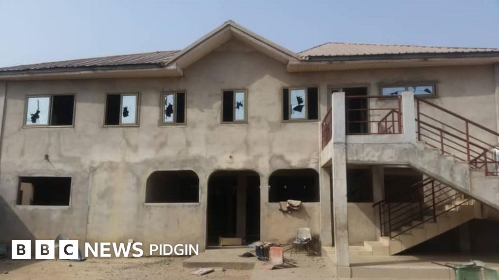 Dem bring down di sign board of di church, wen dem enter di premises dey break windows, destroy di security post, window glasses, church keyboard plus clubs, stones den machetes, yestee.
