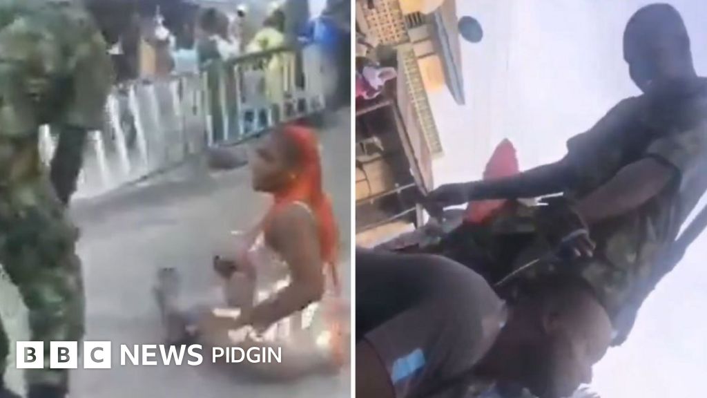 Di viral video show as di sojas order one young lady wey wear spaghetti dress wit orange hair to siddon for ground for one filling station while one of di sojas dey flog her bottom.