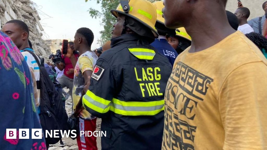 Di Lagos Rescue Unit (LRU), Lagos State Fire Service and Lagos State Ambulance Services (LASAMBUS) all dey on di site for di rescue operation.
