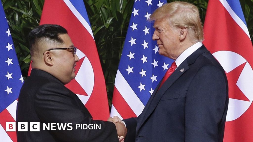 Donald Trump and Kim Jong-un become di first sitting US president and North Korean leader to meet, afta dem bin don dey give each oda mouth for almost one year.