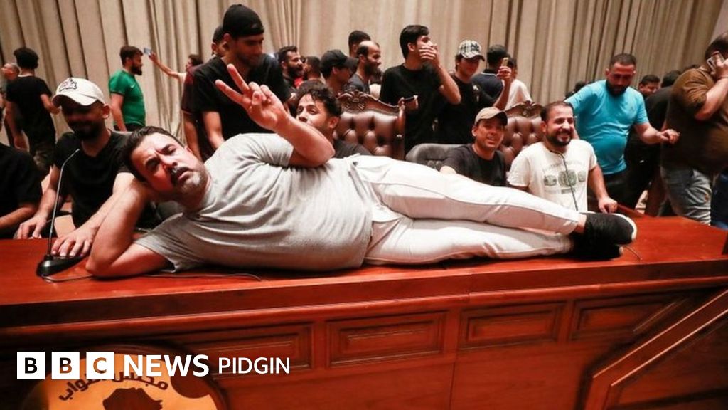 Iraq current prime minister, Mustafa al-Kadhimi don call on protesters to comot di building as di demonstrators dey sing, dance and lie down on top tables.