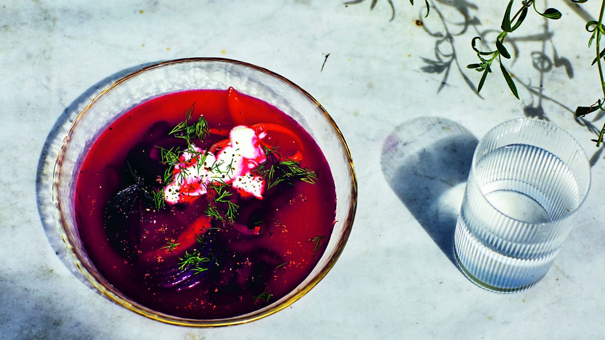 Borsch to Eastern Europe and Russia is like hummus to the Middle East. We all eat it, we all love it, yet we simply can’t imagine that any other country owns the rights to it. It has its origin in a hogweed soup commonly consumed by the Slavs from the 15th–16th century in territories occupied today by Poland, Ukraine and Russia. There are so many variations of the soup, not only in each country but in different regions within those countries, that borsch often becomes synonymous with Eastern European soup. As much as I love a good traditional borsch, and to me this means a passionately red beetroot soup, cooked with a soffritto base as my Jewish–Ukrainian greatgrandma would do, I sometimes struggle eating a plateful of chunky discoloured vegetables that have given all their best to the broth. So here I am taking a bit (okay, a lot) of creative licence, offering my own take on the iconic dish, which consists of a rich red broth, raw sauerkraut, roasted vegetables and baked red kidney beans. Lovers of traditional borsch recipes look away – this one is pretty iconoclastic!