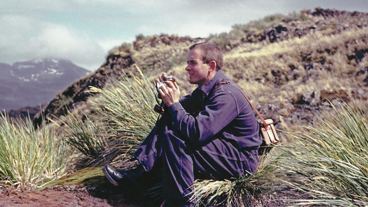 This is me with my Voigtlander Prominent camera. I bought it the first time I went down to South Georgia — to work as an electrician for Christian Salvesen, Britain's biggest whaling company. I was employed first at Leith Harbour on South Georgia from 1954 and, later, on floating factory ships until 1961.