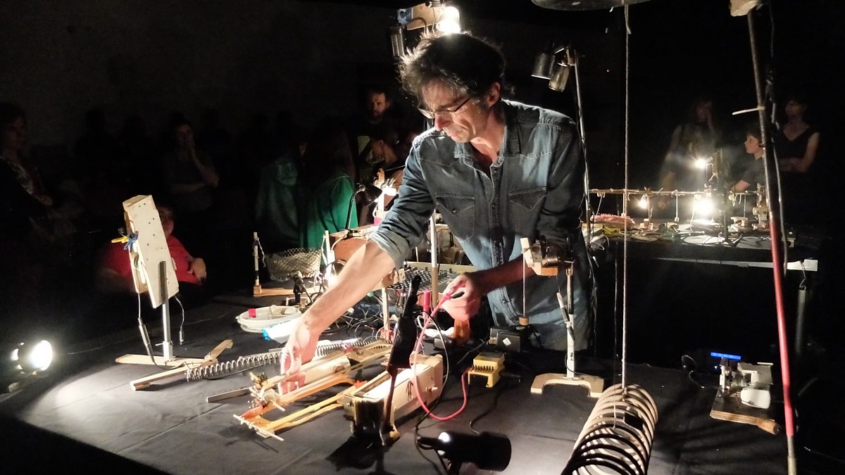 “I often begin with a simple acoustic or amplified instrument that I use for a while before making a machine that plays it. What I like to hear is a rumour, a soundscape in which randomness and determination merge, the wanted and unwanted”, he explains.