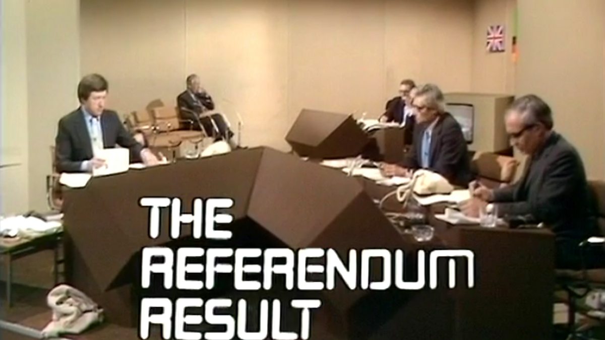 David Dimbleby presents coverage of the result of the UK referendum on whether Britain should remain in the European Economic Community, with analysis of the vote by election expert David Butler. First shown on Friday 6 June 1975.