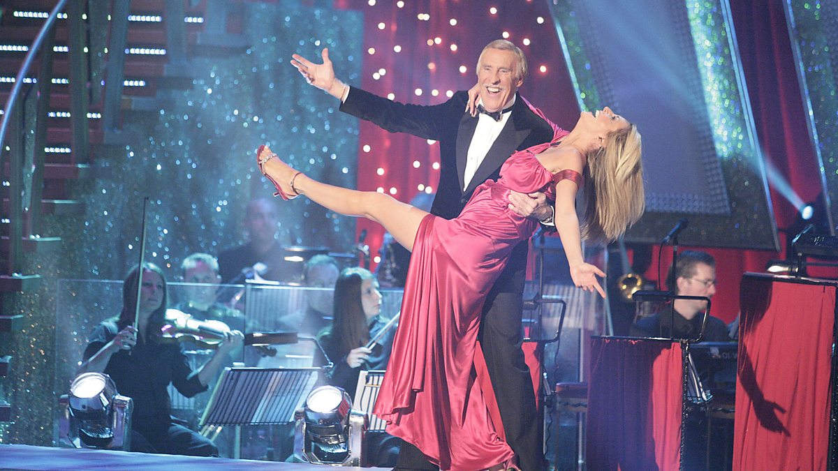 Bruce Forsyth and Tess Daly present as celebrities pair up with professional dancers to compete in a ballroom dancing competition. First up, the men dance the waltz or cha cha cha.