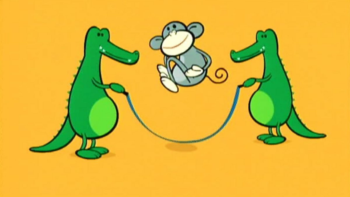 Children's series. Bruno learns to skip with green crocodiles. Let's count how many times he jumps!