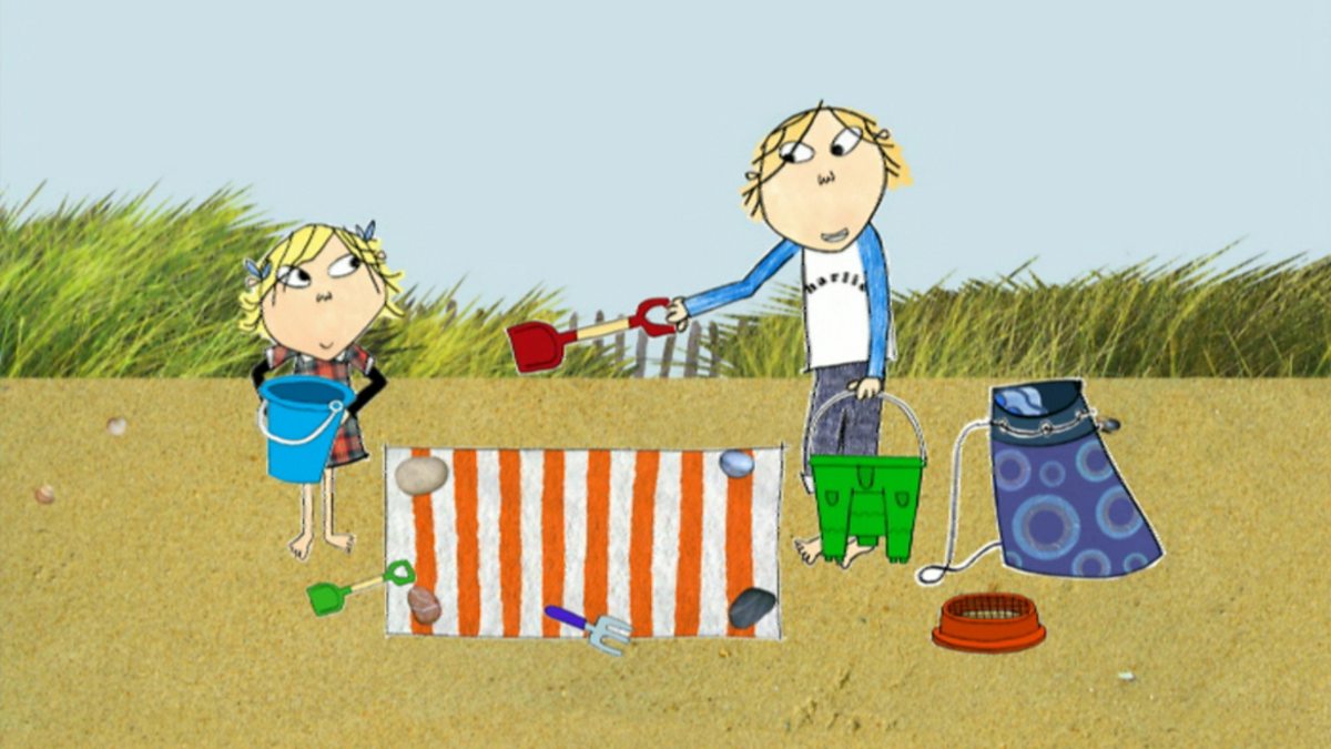 Tha Charlie is Lola a' deanamh caraidean ura air an traigh. Charlie and Lola are playing on the beach.