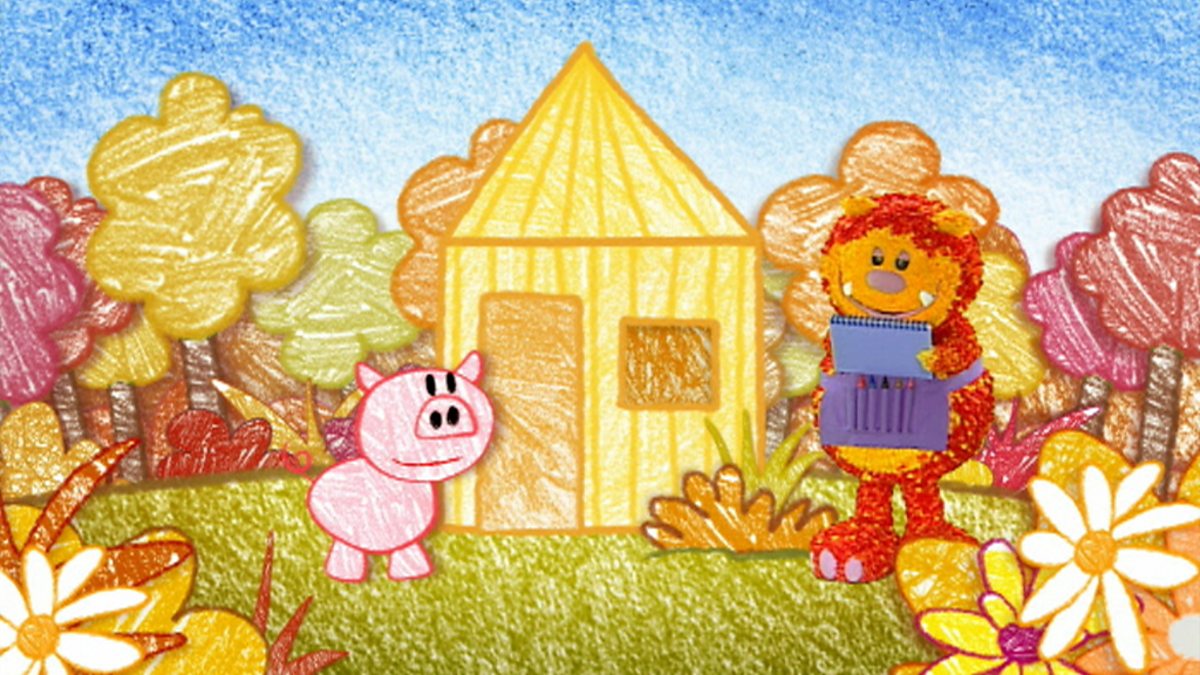 Sgrìobag is a monster who lives in a plain white world, but with the help of her pencils and paper it does not stay white for long. Sgrìobag uses a straight line to a draw a whistling pig called Murchadh. He is very happy in his straw house once Sgrìobag has drawn him a bed to sleep in, but then a big wolf turns up and blows his house down. So Sgrìobag draws Murchadh a new house, this time made of bricks. But was the wolf really trying to blow his house down?