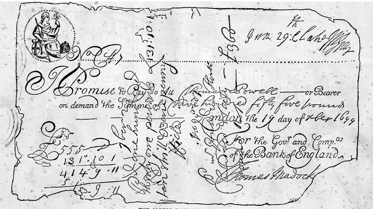 Image: The oldest known bank-note, issued by the Bank of England in 1699.