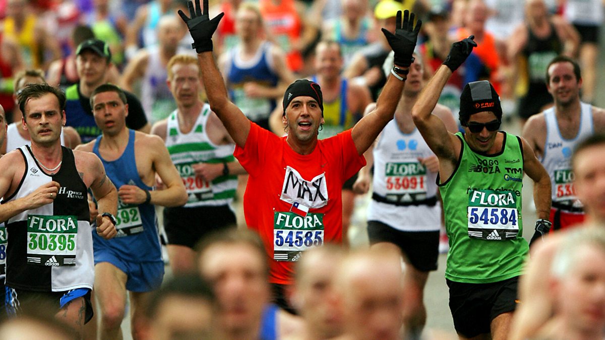 John Inverdale presents coverage of the famous race, with commentary from Mike Costello. Reporters along the course also describe the efforts of thousands of fun runners.