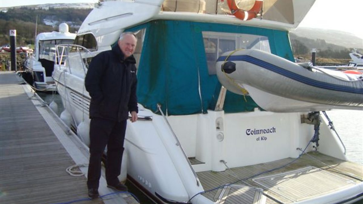 Iain MacIlip le Catriona Mhoireach a' coimhead ri bà taichean san Leargaidh Ghallda. Iain MacKillop takes Catriona Murray boat-spotting in his favourite place, Largs.