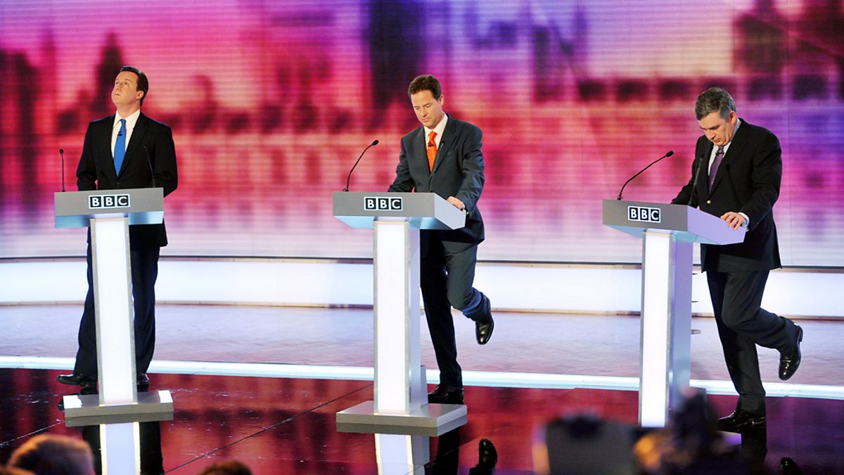 The leaders of the three main parties debate. The final prime ministerial debate focuses on the issue of the economy, jobs, debt and the recession.