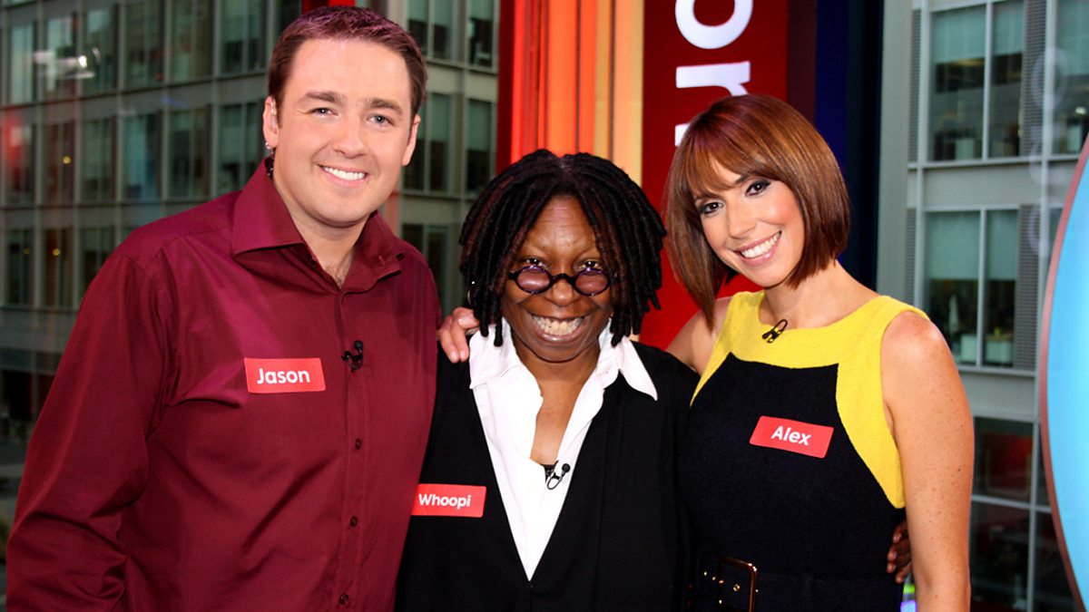 Presenters Alex Jones and Jason Manford make their debut on the sofa and welcome Hollywood royalty Whoopi Goldberg.
