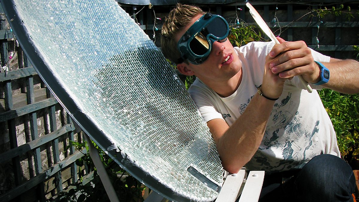 But the last thing you'll find in this programme is a particle accelerator. All Greg needs is the stuff that's lying around. So, you want to prove the Big Bang really happened? Easy - it can all be done by playing guitar at 60 mph and blowing up a watermelon in super slow-motion.