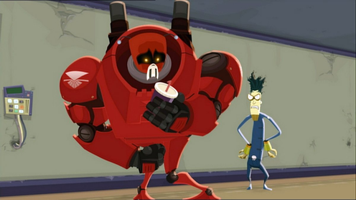 A dry cleaner accidentally mixes up Bholtar's pajamas with Scullosus's exo-suit, which begins to malfunction and takes Bholtar on an evil rampage when he accidentally pees in it.
