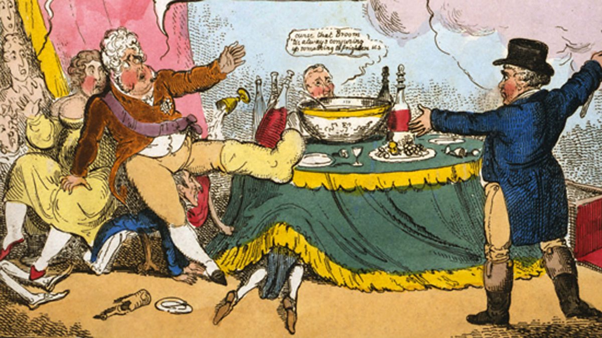 Image: Detail of 'Economy': Lord Brougham as John Bull, calling on the Prince Regent (later George IV) to retrench and curb his extravagance and to think of the people. Sitting next to the Regent is his mistress, Lady Hertford. Cartoon by George Cruikshank, London 1816.