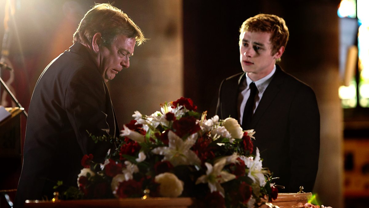 Peter volunteers to take over and gives an emotional speech, saying goodbye to Lucy, telling her that he loves her. Ian and Jane sit outside the church and he tells her that he feels he’s ruined Lucy’s perfect send-off. Jane counsels him, telling him that he did his best. Ian reminisces about when they were all together as a family and says he’d give anything to go back to that time. Jane tells him he can’t go back, leading Ian to confess to Jane that he loves her. Ian asks Jane if she loves him and she admits she does but that it’s too messy to act on. In church, Tamwar finds a condolence card on the floor that says “Rot in hell”, and pockets it.